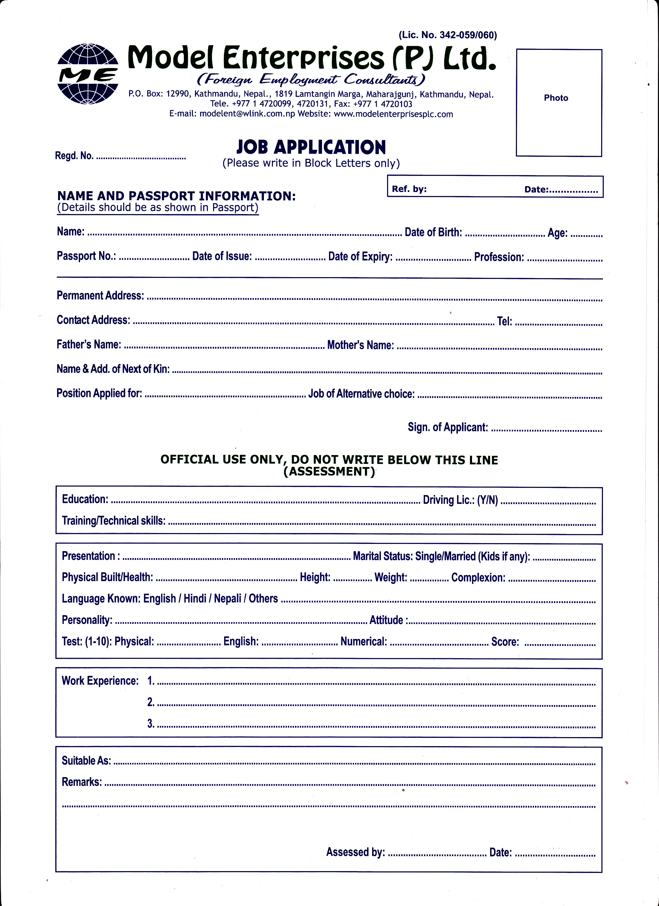 Model Enterprises (P) Ltd., is a company that incorporated under the Foreign Employment Act 1985 of Nepal with License No. 342/059/060. The primary objective of this company is to cater the competent manpower seeking foreign employment within the legitimate scope as per the requirement of foreign companies for the optimum benefit of both the parties...